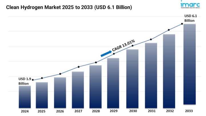 The Clean Hydrogen Market is experiencing rapid expansion, driven by Government Policies and Regulations, Technological Advancements in Electrolysis, and Increasing Investment from Private Sector. According to IMARC Group's latest research publication, "Clean Hydrogen Market: Global Industry Trends, Share, Size, Growth, Opportunity and Forecast 2025-2033", The global clean hydrogen market size was valued at USD 1.92 Billion in 2024. Looking forward, IMARC Group estimates the market to reach USD 6.10 Billion by 2033, exhibiting a CAGR of 13.01% during 2025-2033.