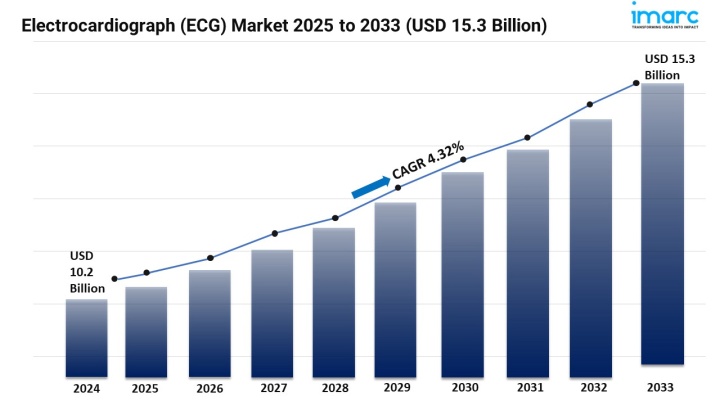 The electrocardiograph (ecg) market is experiencing rapid growth, driven by remote monitoring & telehealth, miniaturization & wearable technology, and ai-driven diagnostics & automation. According to IMARC Group’s latest research publication, “Electrocardiograph (ECG) Market : Global Industry Trends, Share, Size, Growth, Opportunity and Forecast 2025-2033“, offers a comprehensive analysis of the industry, which comprises insights on the global electrocardiograph (ecg) market share. The market size was valued at USD 10.23 Billion in 2024. Looking forward, IMARC Group estimates the market to reach USD 15.26 Billion by 2033, exhibiting a CAGR of 4.32% from 2025-2033.