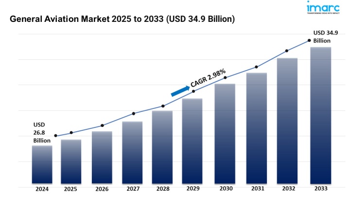 The General Aviation Market is experiencing steady expansion, driven by Rising Health Awareness Among Consumers, Product Development Innovation and Expanding Retail and Online Distribution. According to IMARC Group's latest research publication, "General Aviation Market Market: Global Industry Trends, Share, Size, Growth, Opportunity and Forecast 2023--2033", The global general aviation market size was valued at USD 26.8 Billion in 2024. Looking forward, IMARC Group estimates the market to reach USD 34.9 Billion by 2033, exhibiting a CAGR of 2.98% from 2025-2033.