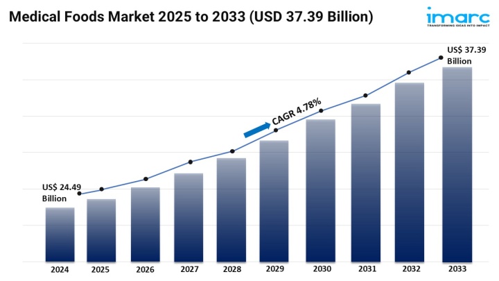 The Medical Foods Market is experiencing steady expansion, driven by Rising Health Awareness Among Consumers, Product Development Innovation and Expanding Retail and Online Distribution. According to IMARC Group's latest research publication, "Medical Foods Market Market: Global Industry Trends, Share, Size, Growth, Opportunity and Forecast 2024--2033", The global medical foods market size was valued at USD 24.49 Billion in 2024. Looking forward, IMARC Group estimates the market to reach USD 37.39 Billion by 2033, exhibiting a CAGR of 4.78% from 2025-2033.