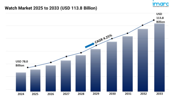 The watch market is experiencing rapid growth, driven by Rising Demand for Luxury Watches, Surge in Smartwatch Adoption and Growing Disposable Incomes in Emerging Markets. According to IMARC Group's latest research publication, "Watch Market Size, Share, Trends and Forecast by Type, Price Range, Distribution Channel, End User, and Region, 2025-2033", The global watch market size was valued at USD 78.0 Billion in 2024. Looking forward, IMARC Group estimates the market to reach USD 113.8 Billion by 2033, exhibiting a CAGR of 4.25% during 2025-2033.