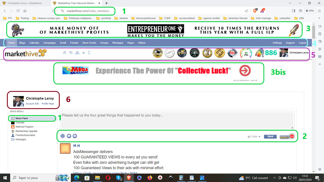 L'encadré 3 & 3bis entouré de vert est la publicité dans Advertising. L'encadré 3 est la publicité la plus grande. L'encadré 3bis, en cliquant sur View All, vous verrez l'intégralité des pubs du BIX, le Banners Impressions Exchange.