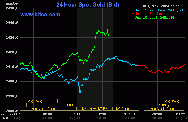 Gold prices are solidly higher and hit a seven-week high in midday U.S. trading Monday. Silver prices are near steady. Overall, bullish technical charts that have become even friendlier lately are prompting more speculators to the long side of the yellow metal. Silver is also bullish, but that market took a pause today. August gold was last up $16.70 at $2,437.50. September silver was down $0.017 at $31.145.