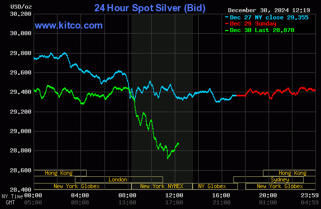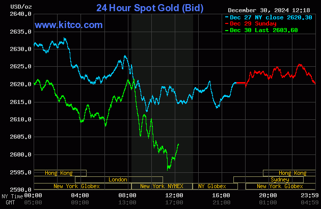 Gold and silver prices are solidly down in midday U.S. trading Monday. A rally in the U.S. dollar index is a bearish daily “outside-market” element for the precious metals. Technical-based selling from the shorter-term futures traders is also featured today, amid a lack of fresh, bullish fundamental news recently. Look for a quieter trading day Tuesday, what with the New Year holiday coming on Wednesday when most markets worldwide are closed. February gold was last down $18.60 at $2,613.20 and March silver was down $0.558 at $29.41.