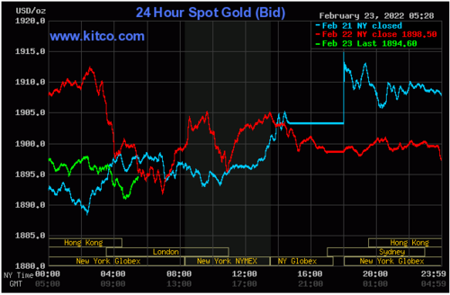 "It is not yet clear when this will happen. Any deployment of military units to Ukraine would presumably be seen as tantamount to an invasion. The West would probably react by imposing sanctions on Russia. The U.S. administration already plans to slap further sanctions on Russia today," said Commerzbank analyst Daniel Briesemann. "Gold remains in demand as a safe haven amid all this turmoil."