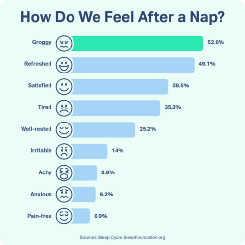 Many people who get insufficient sleep try to use naps to catch up on sleep, but napping can deregulate a person’s sleep schedule even further. Naps can make it harder to fall asleep at a normal time, and long naps can leave you disoriented and sluggish. Though napping is not inherently unhealthy, relying on naps to try to cope with regular sleep deprivation is unhelpful. When you do need a nap, it is best to keep it shorter than 30 minutes and early in the afternoon.