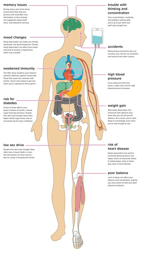 If it continues, lack of sleep can affect your overall health and make you prone to serious medical conditions, such as obesity, heart disease, high blood pressure and diabetes.