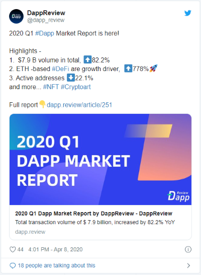 A new report issued by analytics site DappReview shows that the number of dapp transactions that occurred in Q1 of 2020 increased tenfold over the same period in 2019. A transaction volume of just under $8 billion over more than a dozen blockchains took place in Q1 of 2020—an increase of more than 82 percent.