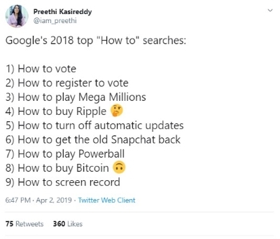 A former engineer at Coinbase, Preethi Kasireddy took to Twitter to highlight some of the Google Trends of 2018: