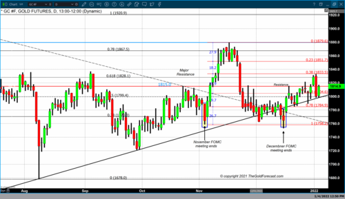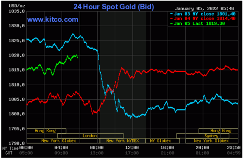 As of 4:23 PM EST gold futures basis, the most active February contract is fixed at $1814.90 after factoring in today's gain of 0.82%, or $14.80. Silver also had strong advances today with the most active March 2022 contract currently up $0.28 and fixed at $23.09. Read More