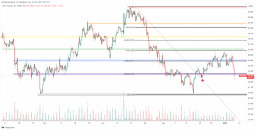 Now on the chart below, the price has made its first lower high lower low wave pattern since 15th December. In this bearishness, the price is currently at a support level of $22.38/oz. Below that the main support on the chart is the consolidation low just below $21.50/oz. Read More