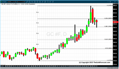 On Tuesday, March 8, gold traded to an intraday high of $2078, roughly $10 below the all-time high of $2088, which was achieved in August 2020. The current decline in gold is the first real price decline since January when gold hit a low of approximately $1780. Until Tuesday of this week, what followed in February was a dynamic rally resulting in gold gaining approximately $300 when gold traded to $2078. On Wednesday, March 9, gold opened above Tuesday’s closing price of $2043 but closed dramatically lower, resulting in a price decline of $72. Tuesday’s strong decline resulted in gold losing 3.49% in value, the largest single-day loss in 2022.