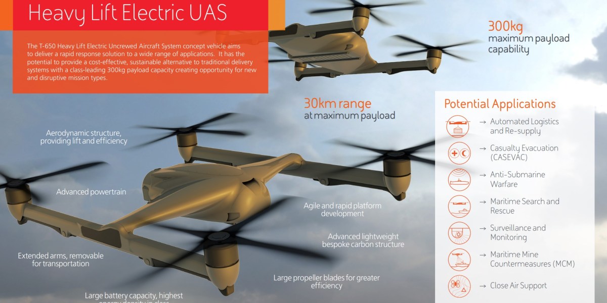 The planned UAV is being angled as particularly useful to defense customers. Potential applications include automated ship-to-ship and ship-to-shore logistics support; evacuation of soldiers and casualties from combat situations; anti-submarine warfare; maritime search and rescue; surveillance and monitoring; maritime counter-measures; and close air support.