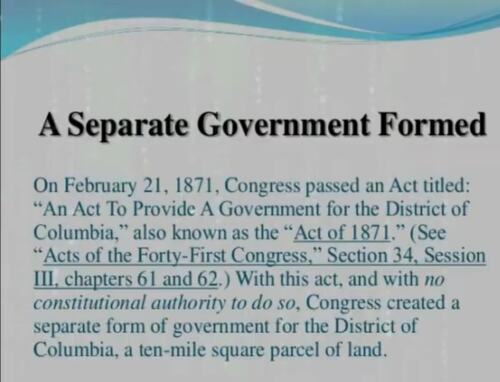The Congress realized that the country was in dire financial straits, so they made a financial deal with international bankers none other than at the time, the Rothschild's of London. Thereby incurring a DEBT to said bankers. However, the international bankers were not about to lend the floundering nation any money without stipulations. So, they devised a way of taking back control of the United States and thus, the Act of 1871 was passed. With no constitutional authority to do so. Congress created a separate form of government for the District of Columbia also known as Washington D.C.
