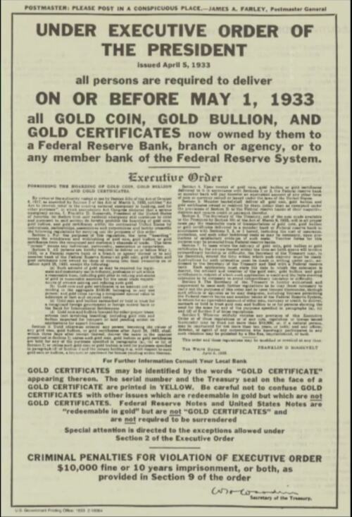 Under the threat of imprisonment for 10 years everyone in America was required to turn in all gold bullion to the Treasury, essentially robbing the public of what little wealth they had left. And at the end of 1933, the gold standard was abolished. If you look at a dollar bill from before 1933 it says it is redeemable in gold.