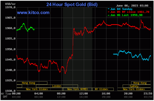Gold futures traded to the lowest low of $1953.80 since hitting $2000 per ounce last week. As of 5:42 PM EDT, gold futures basis most active August 2023 contract is up $8.50 or 0.43% and fixed at $1978.10. The dollar was in essence neutral today trading fractionally lower currently down 0.02% and fixed at 103.935.