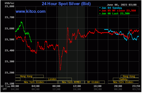 Silver is pointing downward again with the price trading in the mid $23s an ounce as the precious metal struggles for a clear direction.