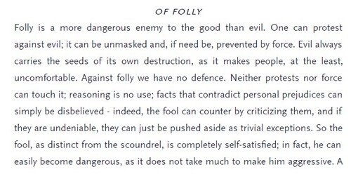 Dietrich Bonhoeffer argued that stupid people are more dangerous than evil ones. This is because while we can protest against or fight evil people, against stupid ones we are defenseless — reasons fall on dead ears. Bonhoeffer's famous text, which we slightly edited for this video, serves any free society as a warning of what can happen when certain people gain too much power.