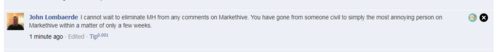 This is to complete the picture: John Lombaerde (jonlomb) is not satisfied with blocking me and other members. He is looking forward to "eliminate" me. Makes me smile what Laura Ashley wrote in one comment .: John, you need meds, dude.