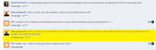 John Lombaerde sent it a few minutes ago. I suppose he is prepared to delete it again, that is his sport. So he says that I am "anti-vaxxer terrorist" and I should be "under surveillance of Czech police" and "if I were Czech citizen I would certainly report you to the police ". And I ask why is John not reporting dozens of other members posting here anti-vaxx messages? And can you imagine how this John L would be important for acting in some totalitarian country ??