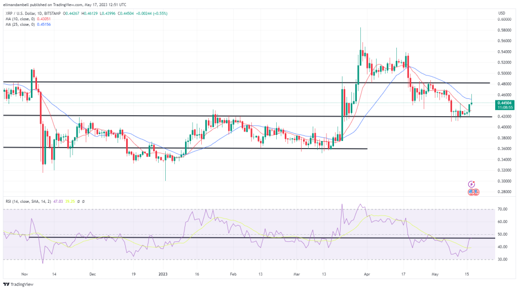 XRP/USD rose to a peak at $0.4596 earlier in the day, which follows on from a low of $0.4202 during yesterday’s session.
