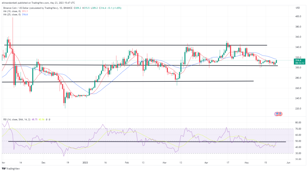 BNB/USD rose to an intraday high of $315.21 in today’s session, 24 hours after hitting a low of $309.13.