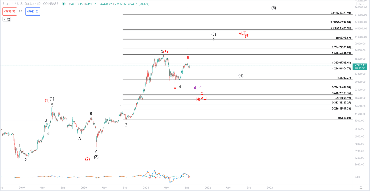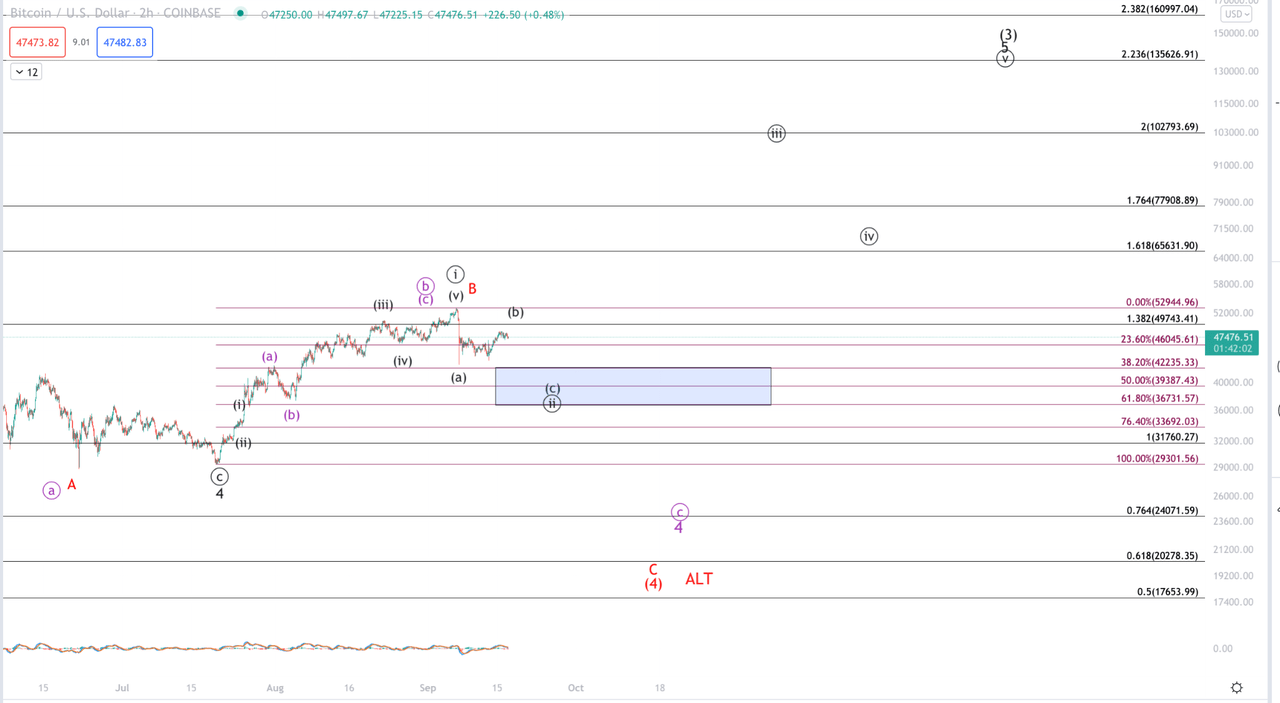 Lastly, the only potential that has not been covered: The steep drop into the Sept. 7 low will not be broken and price breaks back above the Sept. 6 high. Though I don’t view this prospect as likely due to the corrective nature of the rally since the Sept. 7 low, a resounding break back above $53k would strongly signal that the red and purple counts are not worth considering, that the lows are in, and that price is headed up to its next intermediate target, minimally $88k, ideally north of $100k.