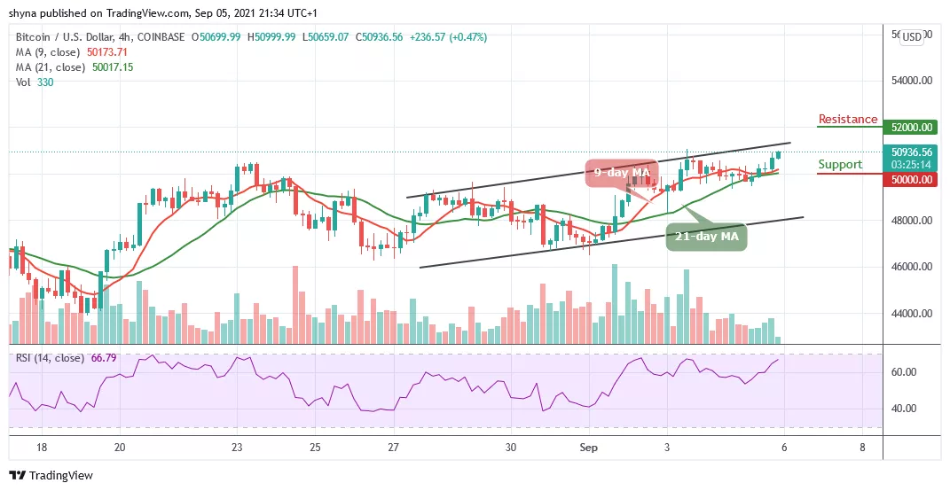 According to the 4-hour chart, the Bitcoin price is seen trading above the 9-day and 21-day moving averages at $50,936. At the time of writing, the Bitcoin price is moving towards the upper boundary of the channel, but any bearish cross below the 9-day moving average may drag the coin to the support level of $50,000 and below.