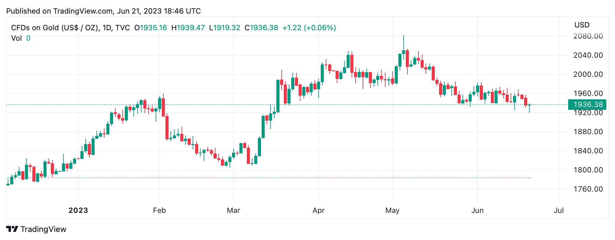 Gold price per ounce against the U.S. dollar on June 21, 2023.
