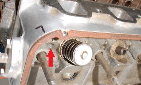 The red arrow points to one of the fitted pushrod bores. Note the small oil orifices drilled diagonally into each of the pushrod bores, and check out the big, square intake ports.