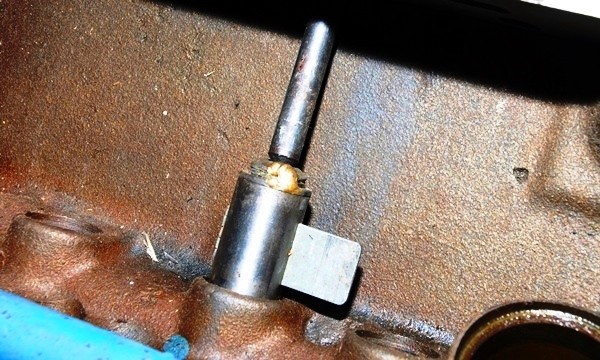 Here’s a closeup of a roller lifter installed in the block, showing the brazed cage that retains the lower third of the pushrod to the lifter body.