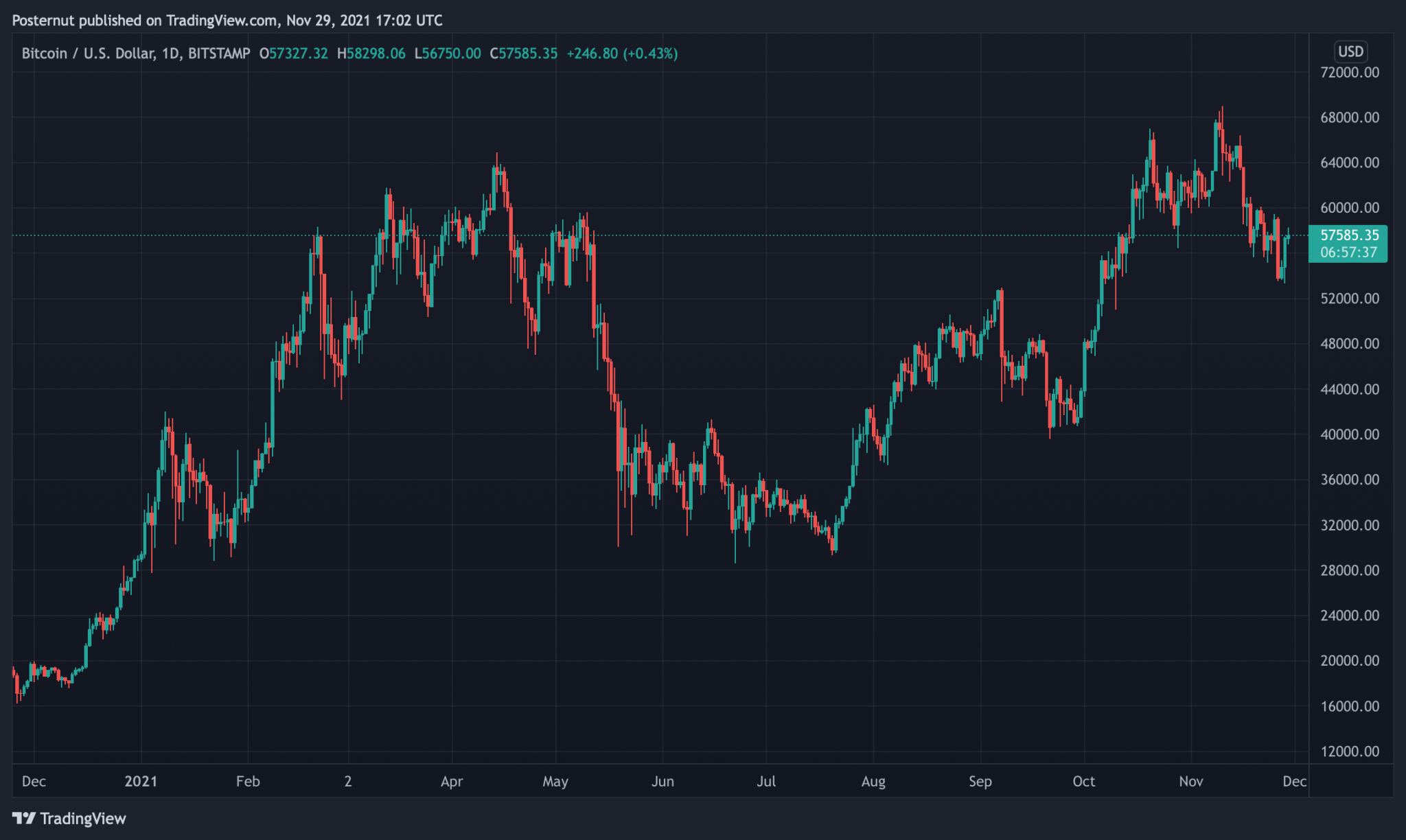 BTC/USD price (daily chart) on Bitstamp on November 29, 2021.
