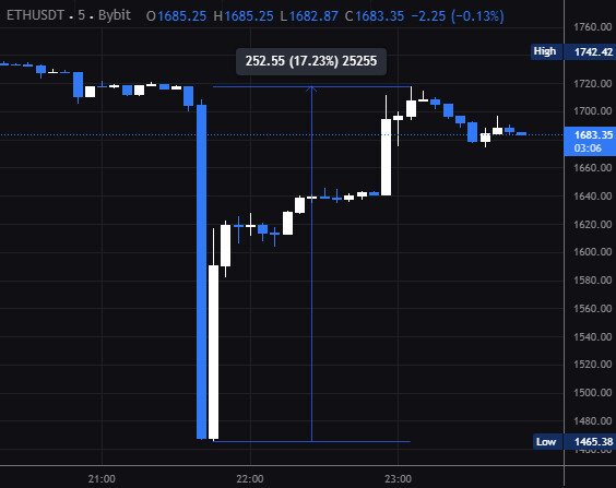 That headline alone caused the Ethereum price to sharply bounce from its low of $1,550 on Binance - even hitting $1,465 on Bybit - back to just under the $1,700 level at the time of writing.